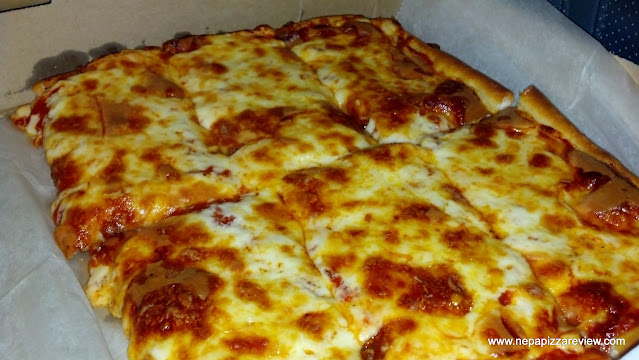 I was eating alone on this night, so I decided to just grab a half-tray of the square pizza, which would be the perfect dinner/lunch leftover combination for me. When I walked in the door, I was greeted immediately, and the pizza was handed to me within seconds so there was no wait – my kind of transaction! The pizza was piping hot, and made even me (with my pizza-making hands, which have nearly all of the nerve endings severed from being burned continually over the years in hot ovens), take a quick run to the car to set this baby down! I expected to see an explosion of steam when I opened the box, but I did not because of the generous layer of slightly charred cheese on top, which sealed in the moisture of the sauce. The heavy portions were welcome, as I’m a big proponent of a little extra sauce.