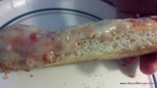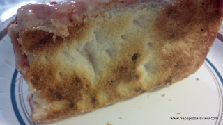The first bite netted a lovely range and balance of flavors with the most prevalent flavor being the cheese blend, which gave me a taste sensation of a nice buttery flavor.  The cheese was melted perfectly to my tastes (as you may recall, I don’t care for burned American cheese on pizza).  Personally I would have liked a little less cheese on the pizza, but I would think I’m in the vast minority here, and most of America would not complain about getting a healthy helping of cheese on their pizza!  Although the flavors of the cheese do work well, they started to get a little monotonous and dried my mouth out a bit, but this is typical of a pizza with a lot of cheese on it.  The sauce was so fresh and delicious, and it was definitely my favorite part of this pizza.  It was simple, yet flavorful, and I think its genius is in its simplicity.  Although I didn’t find any physical chunks of onions, I did catch a hint of onion flavor in the sauce, so I always have to alert my readers who are onion haters of this.  If you just hate having chunks of onions in your sauce and tolerate the flavor, I think you would be okay with this pizza.  The crust was thick and dense as you can see in the photos.  I really enjoyed the flavors which were released from the pizza maker cooking the crust perfectly.  The bottom was perfectly browned and crispy, and the raised edge of the crust was definitely the best part.  It’s sort of a tender, crumbly type of crust as opposed to the more chewy, bread-like crusts out there.  I think the closest crusts I can think of are those from Brutico’s and Salerno’s.
