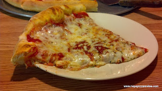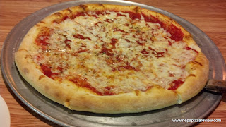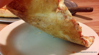 The pizza came out of the oven fresh and hot.  When the waitress brought the pizza to my table,  the first thing I noticed was the very thick and fluffy crust. The crust was like a big circular breadstick surrounding the pie.  There was a drastic contrast between the lightly cooked crust,  the dark red sauce, and the white-looking cheese.  My first bite was taken over by the flavor of the sauce which was a little bitter and tasted a bit like the can it came in. The texture,  consistency,  and seasoning of the tomatoes was pretty good, however. The crust was soft and chewy and a bit doughy especially on the outer handle. It was decent, and actually the strong flavor of the sauce sort of balanced the other two neutral flavors out.  The cheese didn’t add much flavor but it did hold the pizza together.  I thought with another two minutes in the oven, this pizza would have been fully cooked and the ingredients would have had a little more time to get to know each other  and work together.