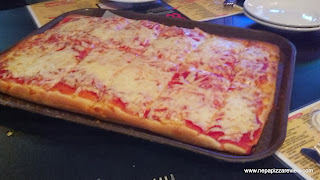 While waiting for the pizza to come out, we grazed on our jumbo chicken wings and raved about how perfectly cooked they were, how flavorful the sauces tasted, and how they applied just the right amount of sauce on the wings. As my mouth was burning from my spicy hot wings, the site of the pizza traveling to our table was a welcome site to calm my taste buds. I immediately identified this pizza as an Old Forge style pizza with a premade, store-bought crust. That didn’t disqualify the pizza from being good, but I always enjoy trying to decide if a pizza is made of fresh dough or not. I removed my first slice noting that the bottom of the pizza was still pretty spongy and not crisped except for in the corners and edges. I would assume this was because it was cooked in a traditional oven rather than a brick oven that cooks from the bottom up – just a guess.