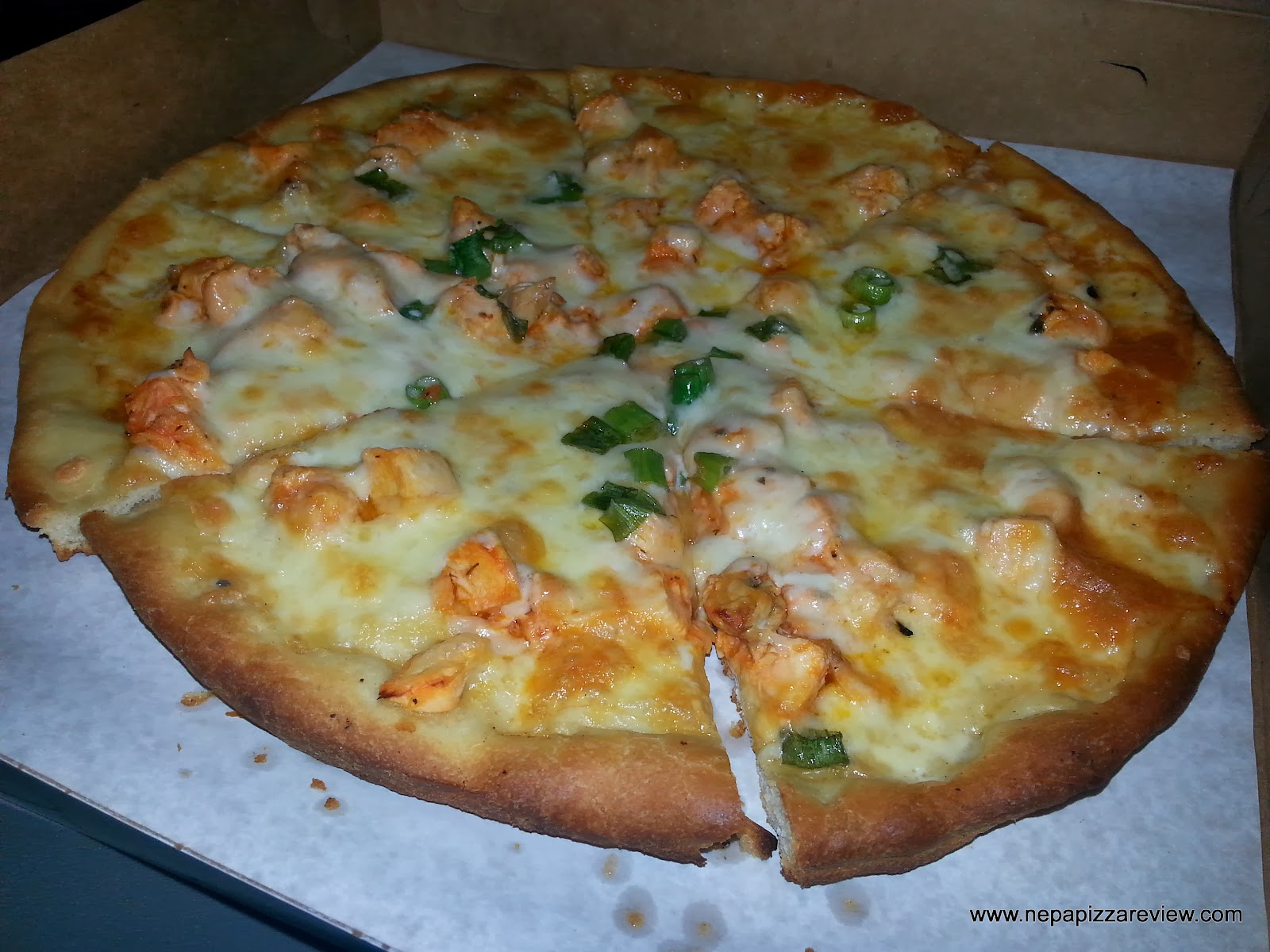 Anyway, I grabbed my pizza and sat down at one of the 8-10 tables to enjoy the pie.  I was starving, so this 12″ plain pie was going to be dinner for one, even though it could probably feed two people easily.  I ordered my hot wing pizza to go, so I watched that pie get prepared as I was evaluating my first pizza.  The pie was simple, with a very crunchy crust, a slightly zesty sauce with a hint of spice, and a sharp cheddar cheese (or similar) with just the right amount of grease.  From the first bite, I recognized this pizza as my next guilty pleasure because the flavors were incredible, and the whole pizza just worked.  The crown jewel of the whole pie was the crunchy crust.  Notice I used the term CRUNCHY, not crispy.  This crust is crunchy throughout, much the same way that a cracker or a pretzel (if it were flat) would be.  I was totally buying into this pizza more and more, bite after bite.  Regardless of how this pizza rated on my “snob meter” I was enjoying the heck out of this thing and experiencing all that Nicholas’ had to offer.