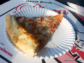From our discussion on the phone, I knew I ordered an 18” pizza, which is huge, and here in NEPA, the going rate is around $14.00 or more for a plain cheese, so when the pizza guy told me it was $9.95 I was totally shocked. That has to be the cheapest 18” pizza I’ve found in the area. I paid him, and ran out to the pizza mobile to get a look at this value pie. I set the pizza down, and my car was filled with a pleasant garlic smell, sort of like when you walk past the fresh baked breadstick oven at the Olive Garden. I was in a hurry, so I couldn’t try the pizza immediately, but the smell was too much and I had to reach for a slice while driving. I opened the box to find a giant pizza with a very thick, fluffy crust, covered with plenty of sauce and cheese. I was very curious about this pizza, because traditionally I like a thin crispy crust, and it was clear that this was not the type of pizza I had ordered, but we don’t judge before we try!