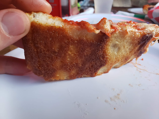 The pizza had a thick crust with a deep browning around the edges, a super hearty and red sauce and a light cheese that had some light char spots scattered across the top.  The crust was super crunchy around the edges and bottom, but quite doughy in the middle.  I very much enjoyed the edge of the crust and could imagine myself only eating the crust and dunking it into some marinara sauce and enjoying the heck of of that!  The bottom was also deeply browned with the signature fried texture and blistering that is often seen in this type of pizza.  There actually was not a lot of grease on this pizza, which is noteworthy for many who have an oil aversion or happen to really embrace it.  The sauce was robust moderately heavily seasoned, which is unique for a fried Sicilian as the style typically relies on a simple crushed tomato type sauce with light seasonings.  The sauce had so much punch that I hardly even noticed the presence of the onions.  Keeley’s went bold with this one and I applaud them for being different.  I can’t be certain what the cheese blend was, but it had the appearance and taste of Mozzarella and was very stringy like mozz.  In any event, it was tasty and the whole pizza was a hearty and robust combination of flavors and textures.