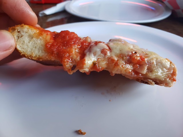 Of course, we also ordered a pizza which is $11.95 for a full 12 cut tray.  At $1 a slice for a pan fried Sicilian, this pizza is a good value.  As always, I get my pan fried Sicilian with onions and the First Lady was on board with that as well.  The place was mobbed so we had a little wait for the pizza but the time passed quickly in such a cool atmosphere.  Fried Sicilian is also quite thick and does take a bit longer to cook.  Before long, the pan fried goodness was on our table steaming hot and daring us to take a bite!  Usually, by the time I take a few photos and videos of the pizza it’s cooled down enough to eat, but this pizza was thick and moist and held the heat!  No matter, I went in for a bite and burned my mouth as expected!  The first lady did the same, but it was worth the slight injury as it was immediately evident that this pizza was different from the rest of the pan fried Sicilians I have tried to date.
