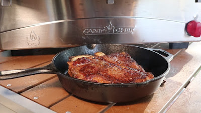 | The sear on this T-Bone steak after preheating the cast iron skillet in the Camp Chef Italia oven was incredible! So juicy inside! |
