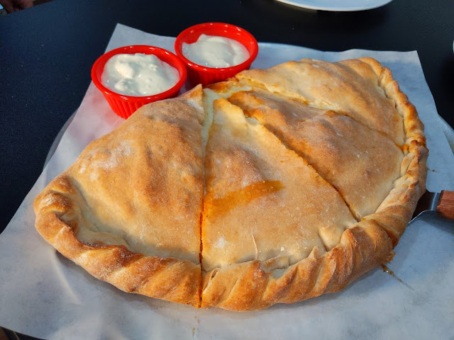 | 1/2 Double Crust Hot Wing Pizza from Gangi Pizza in Throop is equal parts delicious, outrageous, and filling. Their wing sauce is creamy and among the very best in the area. |