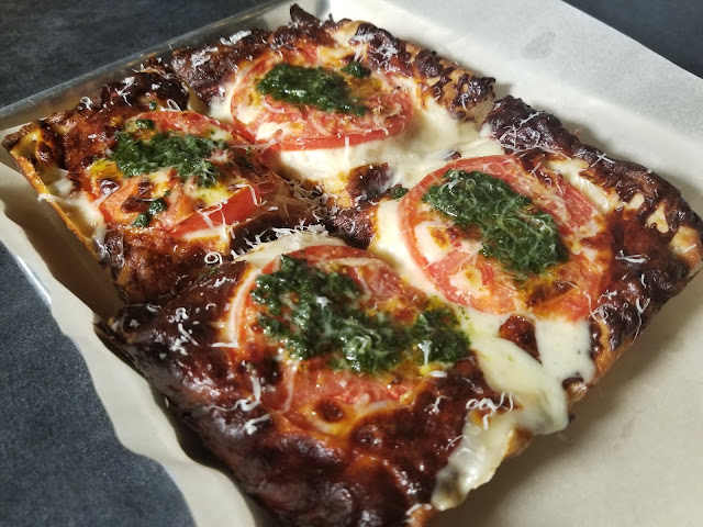 | Fresh tomato and basil with Cooper Cheese Pan Fried Sicilian Pizza at Cosmo’s on Oak. |