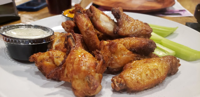 | Wood-Fired Wings at Ringside in Tafton, PA. The wings were smaller but cooked nicely. Buffalo dipping sauce and bleu cheese and celery are also provided. |