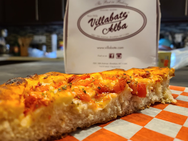 | Tomato focaccia bread “pizza” from Villabate Alba in Brooklyn, NY. |