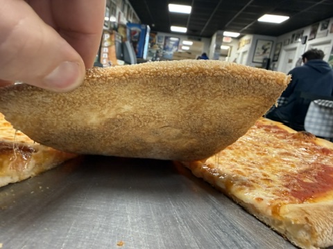 The crust is stretched thin and even, baked to a beautiful golden brown. It’s fully foldable, with just enough crisp on the bottom to give you that initial bite, followed by a nice chew and tenderness throughout.